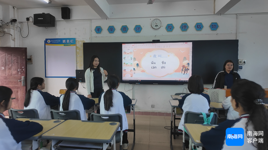 泰国龙成工商管理职业学院老师琼宽•乍莱京正在教海南省财税学校的学生学习泰文。记者 郑光平 摄